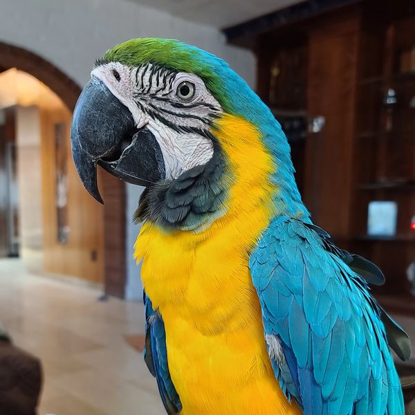 Meet Marsha, a 20-year-old macaw and one of the resident exotic birds at The White Hacienda's aviary. Marsha is a beautiful bird with a vibrant blue and gold plumage, and a personality to match.